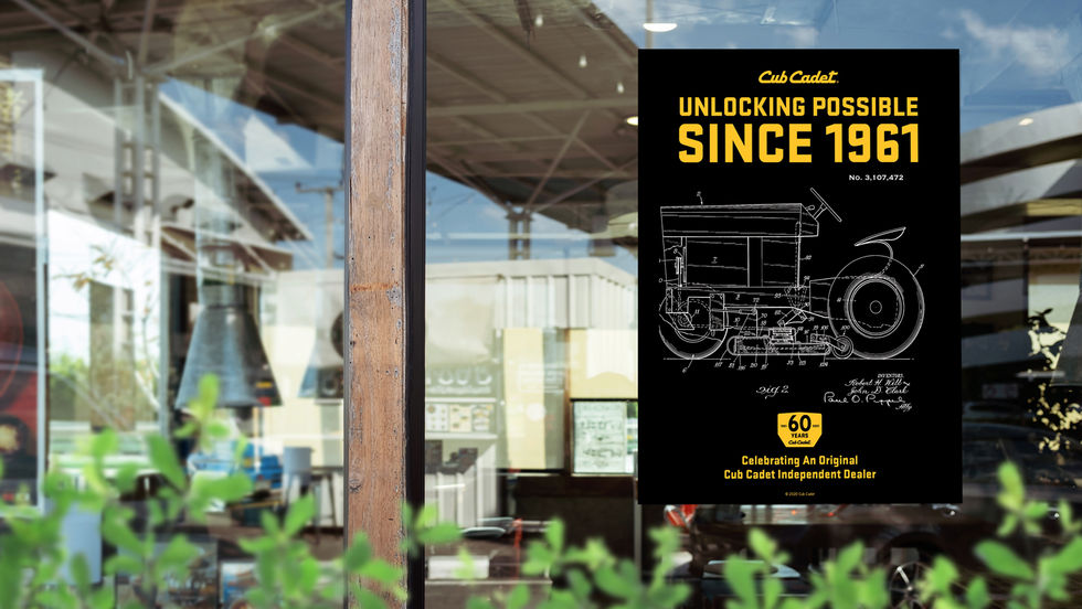 I designed the Cub Cadet printed posters and t-shirts to celebrate the brand’s 60th anniversary, centered around the theme Unlocking Possible Since 1961. The design paired the original XT tractor patent with a modern XT tractor photo, visually highlighting Cub Cadet’s legacy of innovation and evolution over time. These pieces were distributed across independent dealer stores, with posters on display and t-shirts shared with the dealer community, helping reinforce the milestone and connect Cub Cadet’s history with its continued commitment to innovation.